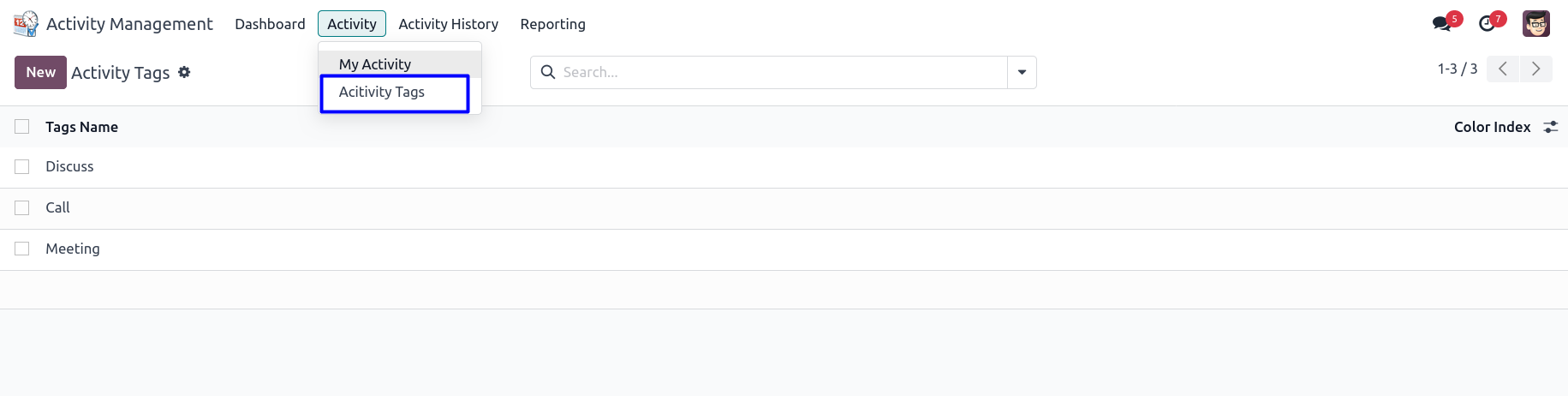 Activity manager or activity supervisor can create and manage tags with color index for activity.