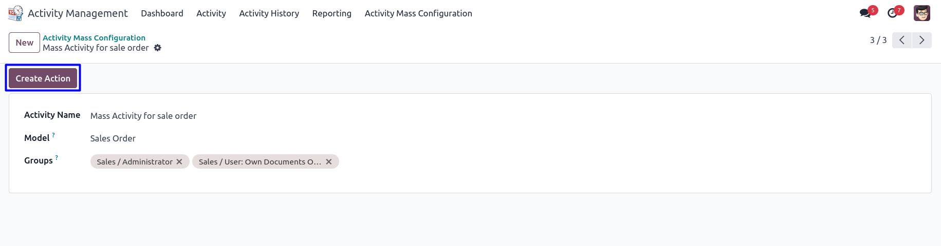 Users can enter activity name, set model and groups for mass activity and click on 'CREATE ACTION' button for create an action.