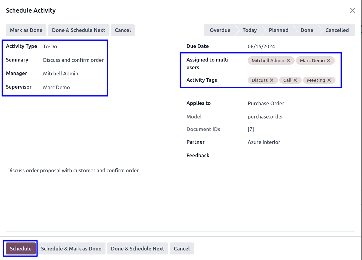 User can select manager and supervisor for activity, user also can assign activity to multiple user, add activity tags, and add description for activity then start activity and click "SCHEDULE" button.