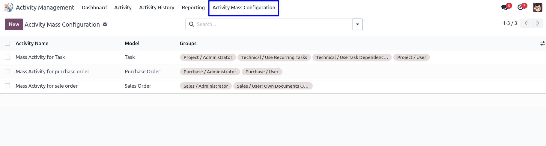 User can create mass activities by configured model and groups.
