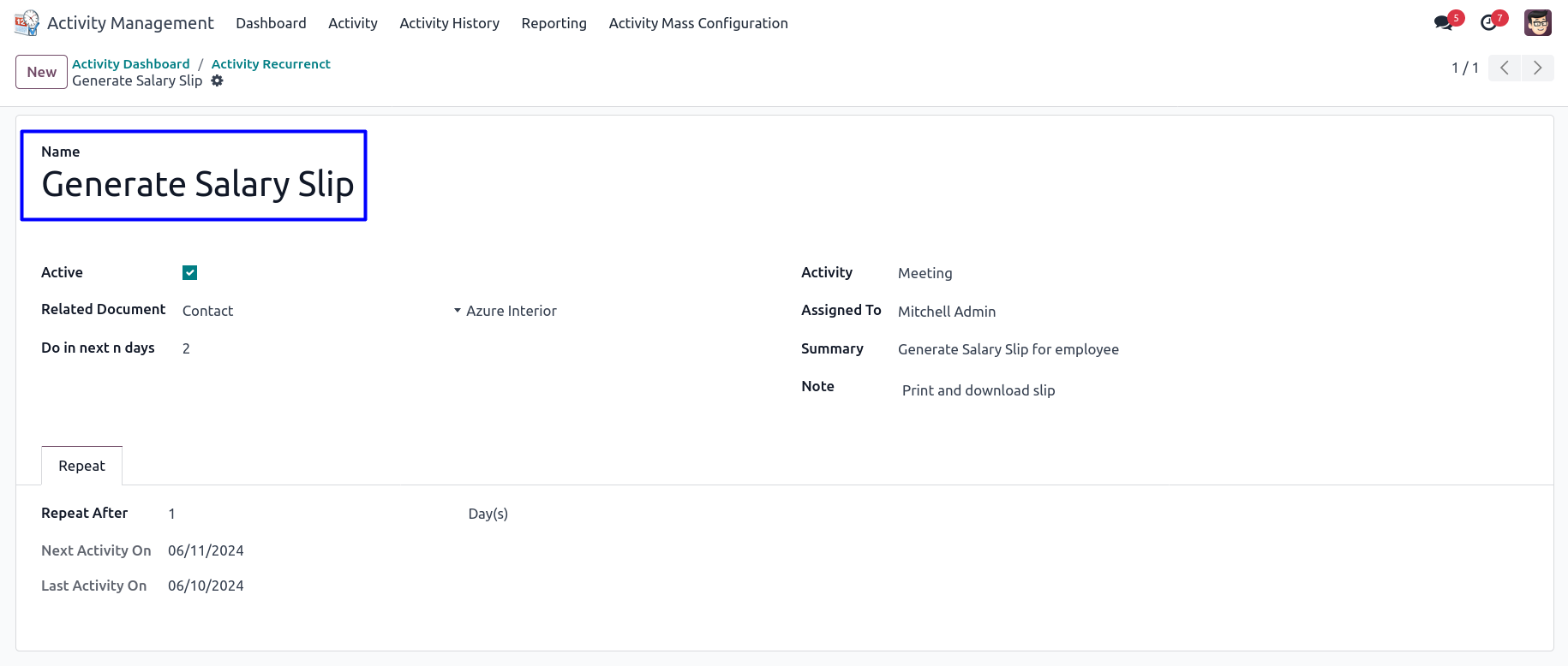 User can create recurrent activity, In the form enter activity name, select related document with that value, select an activity, assigned to person, summary of activity and note.