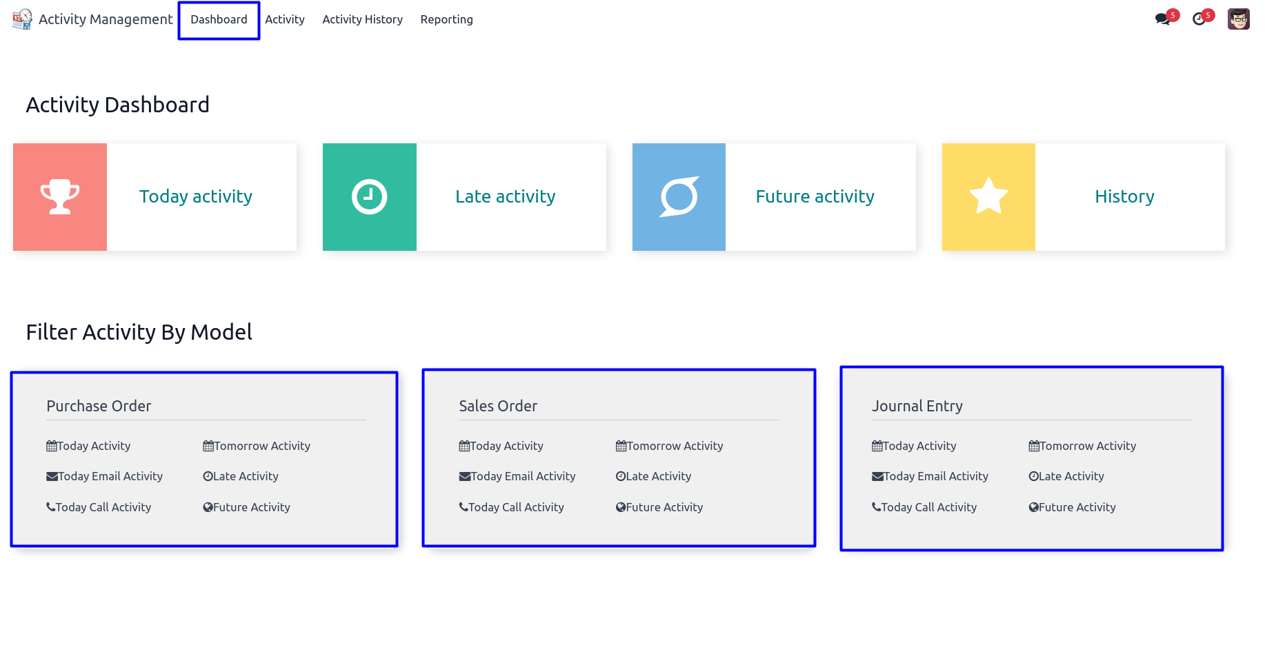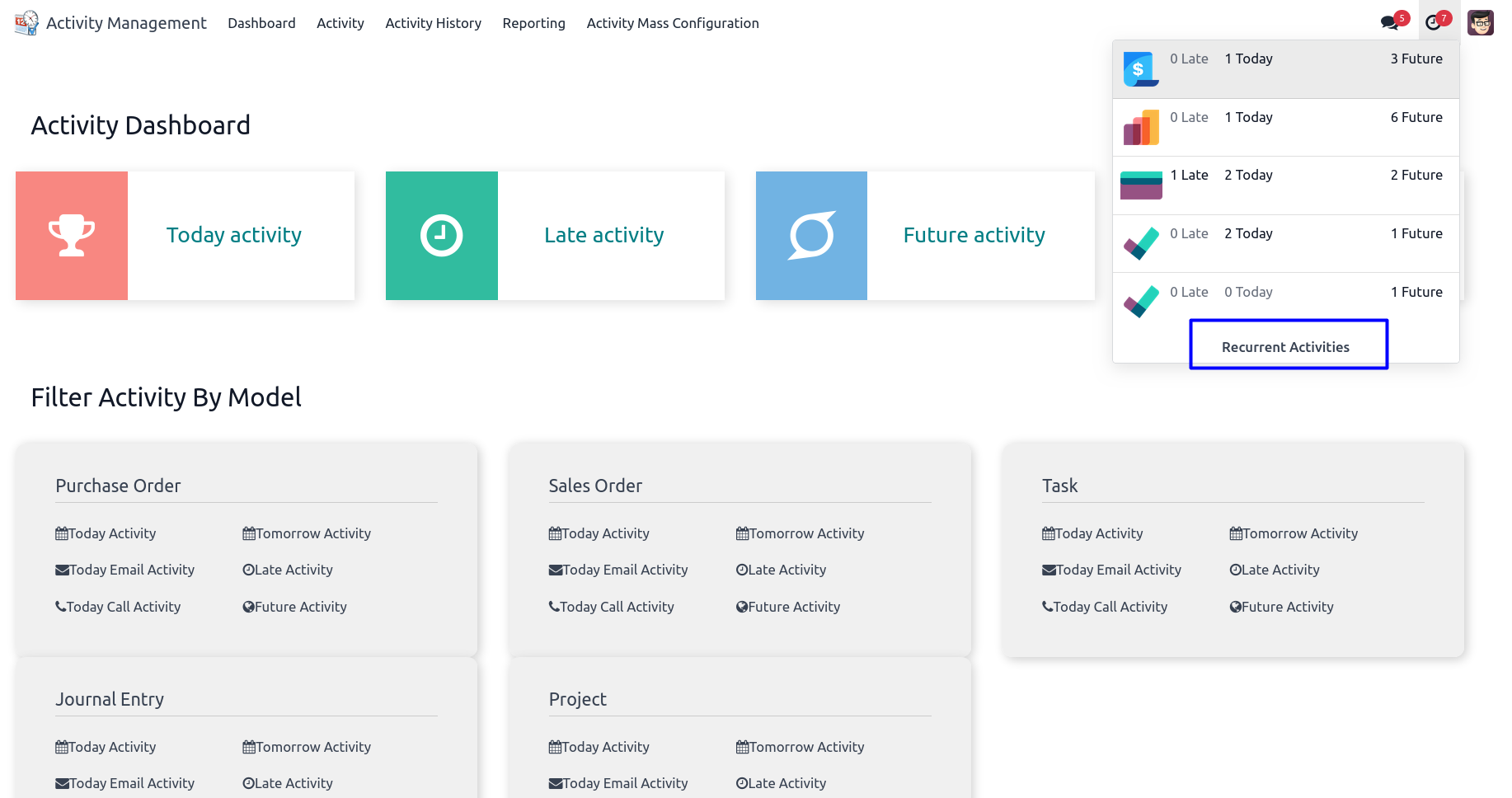 While using activity dashboard user can check today activity, late activity, future activity and activity history with using filter activity by model.