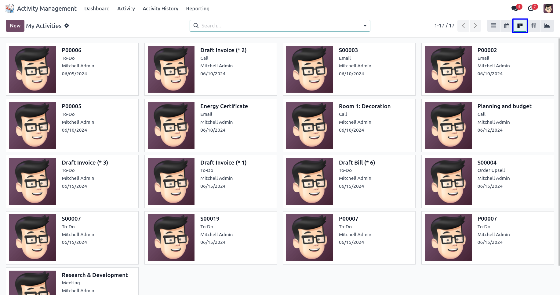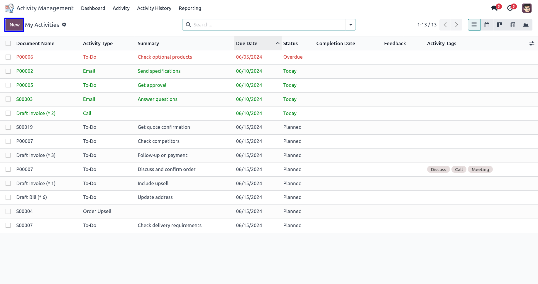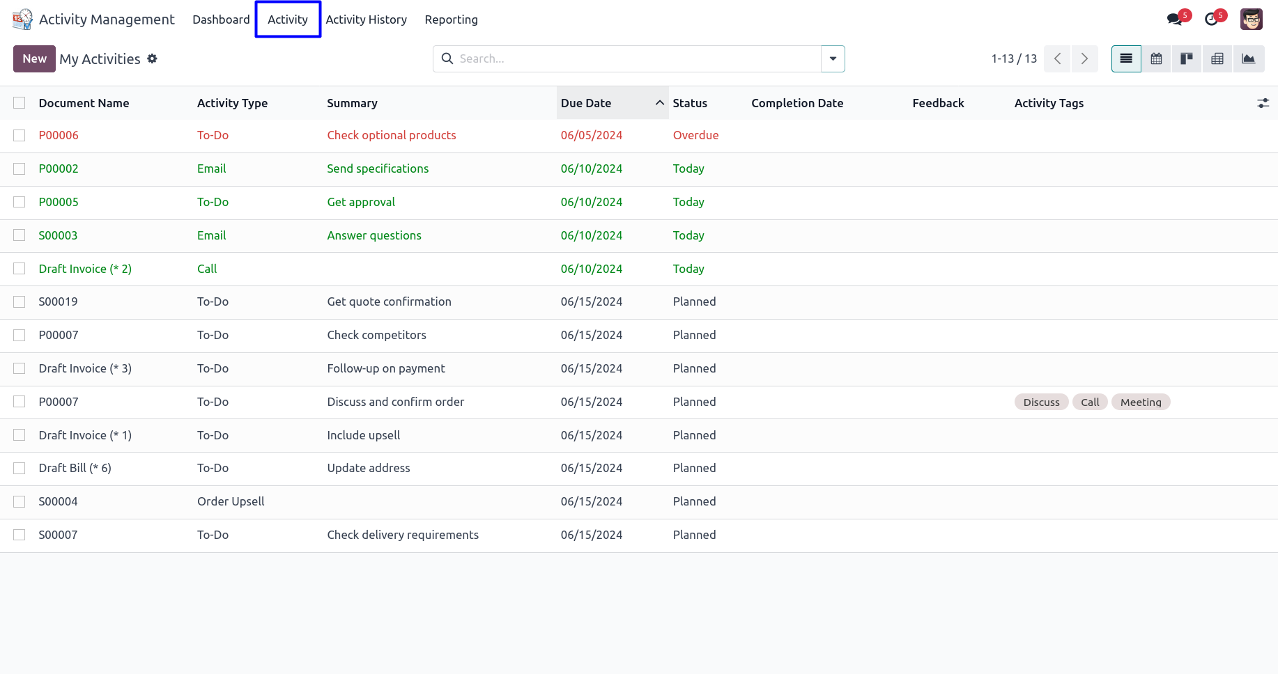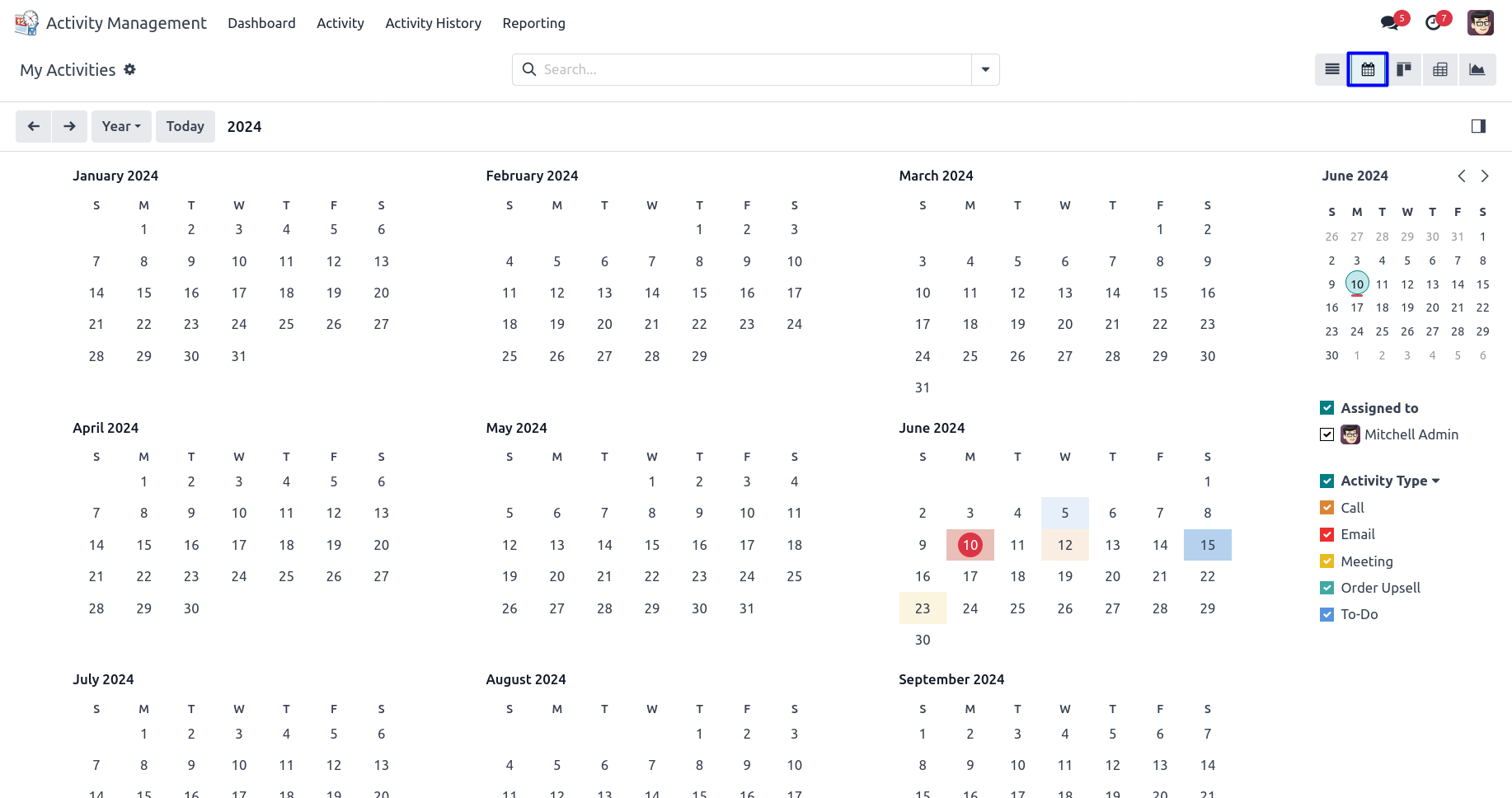 User can use different activity views like a list view, kanban view, calendar view etc.