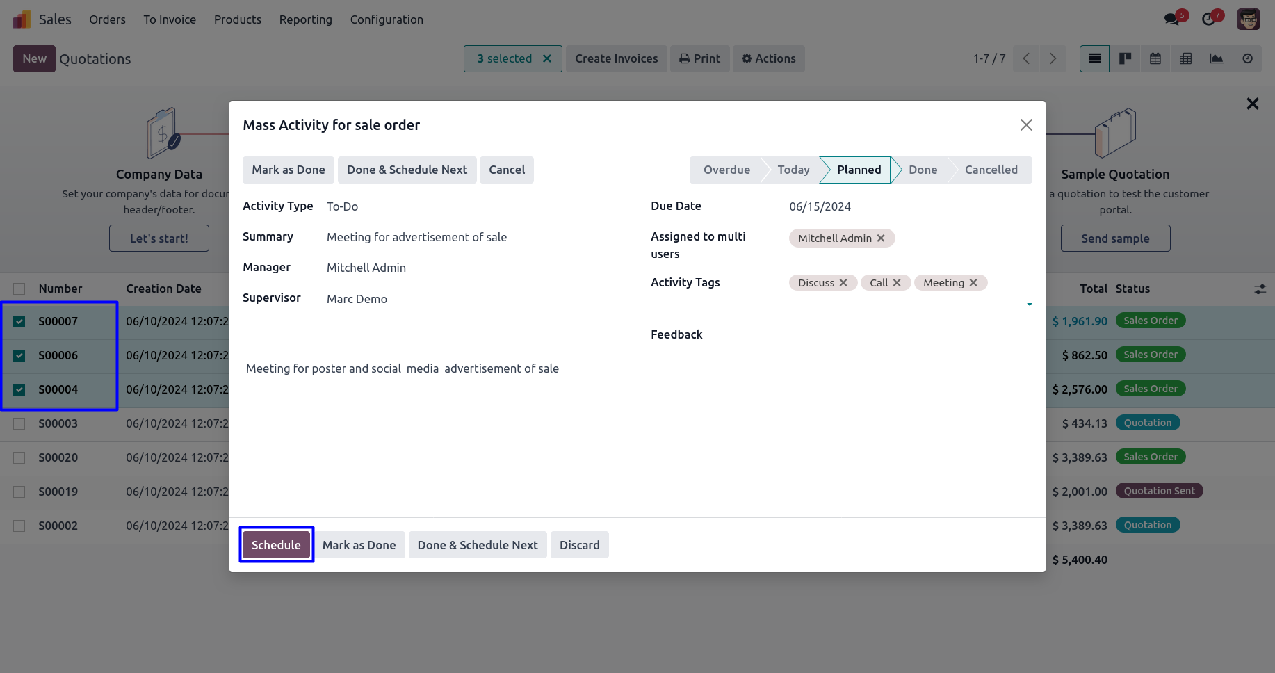 Schedule Mass Activity for Sale Order