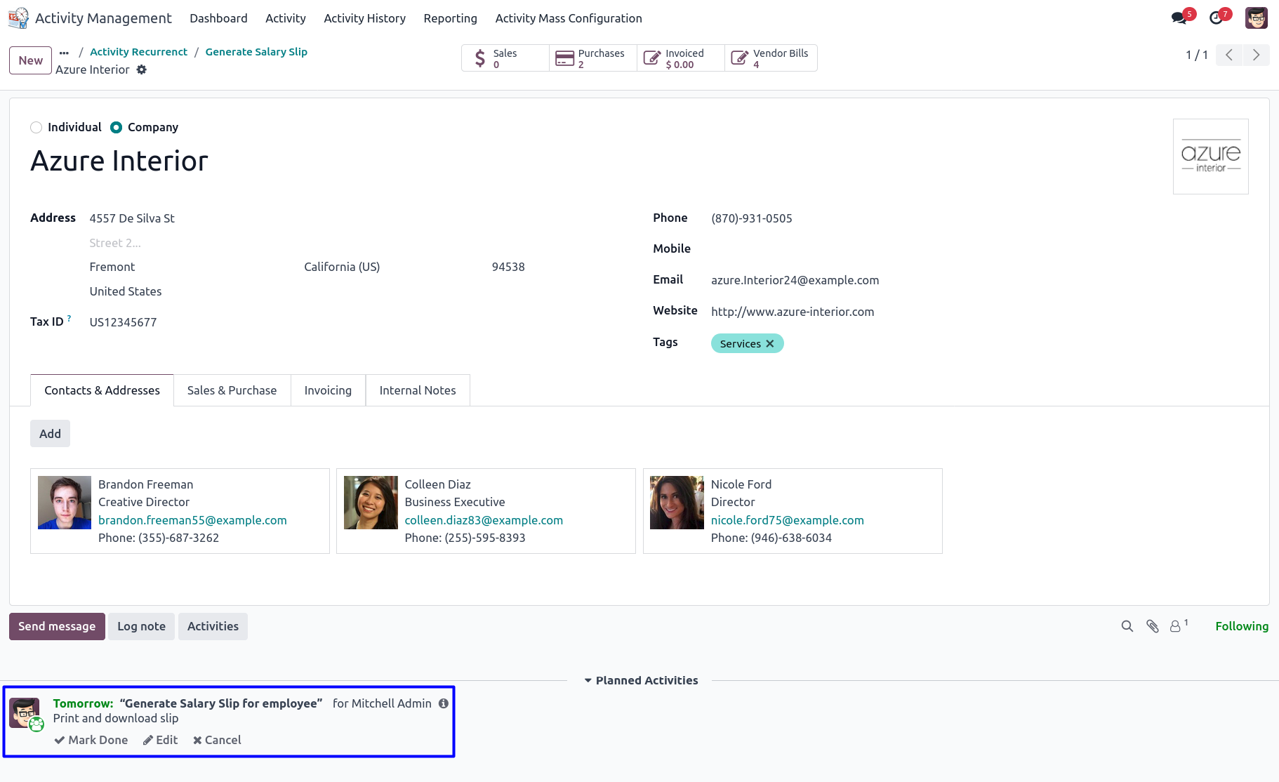 Additionally, users can view scheduled activities through reports like bar charts, line charts, and pie charts, as well as different views like list view, kanban view, and calendar view. Users can create mass activities by configuring models and groups, with options to create or remove actions. Recurrent activities can be generated by showing all or own recurrent activities, with the ability to repeat activities by day(s), week(s), month(s), or year(s). Users can view activity history and utilize scheduled activities across multiple companies. In short, this app is a powerful tool to optimize activity scheduling processes and enhance operational efficiency.
