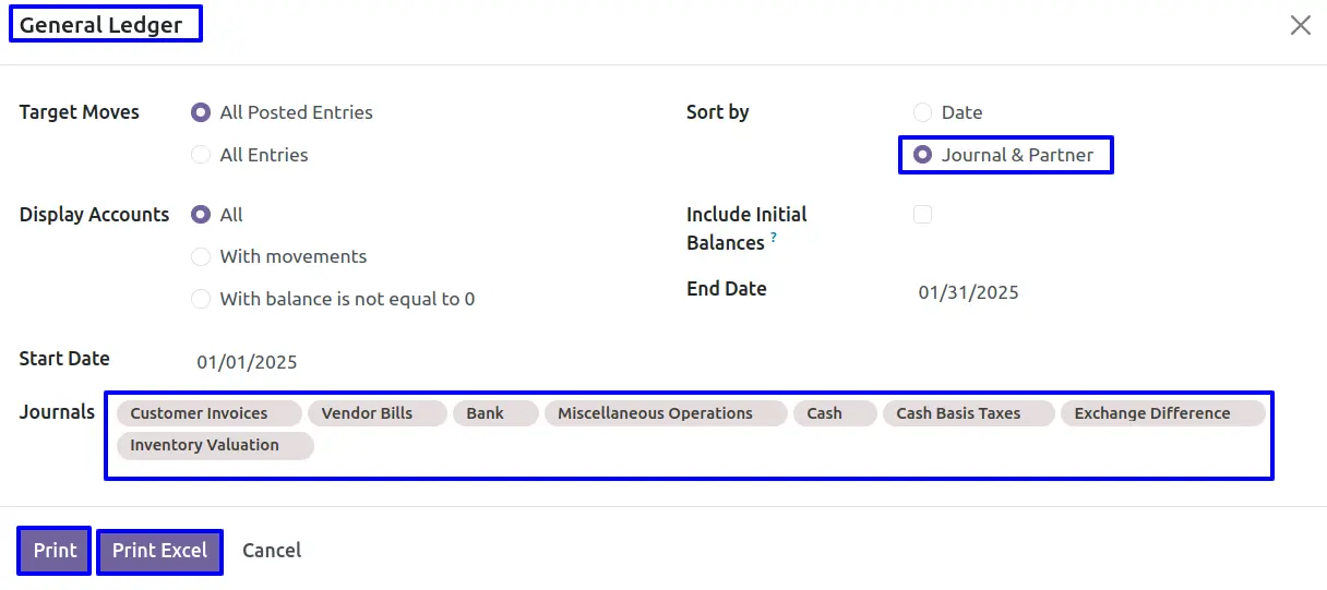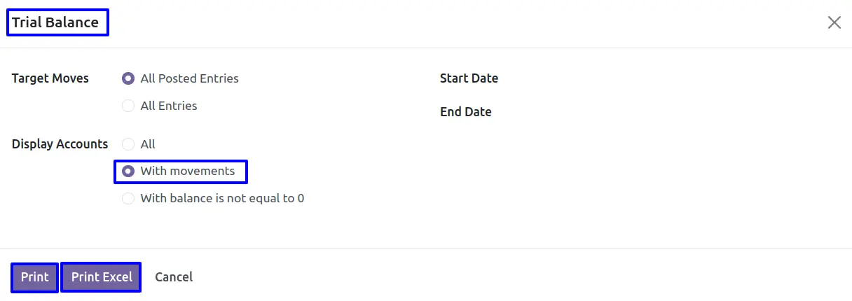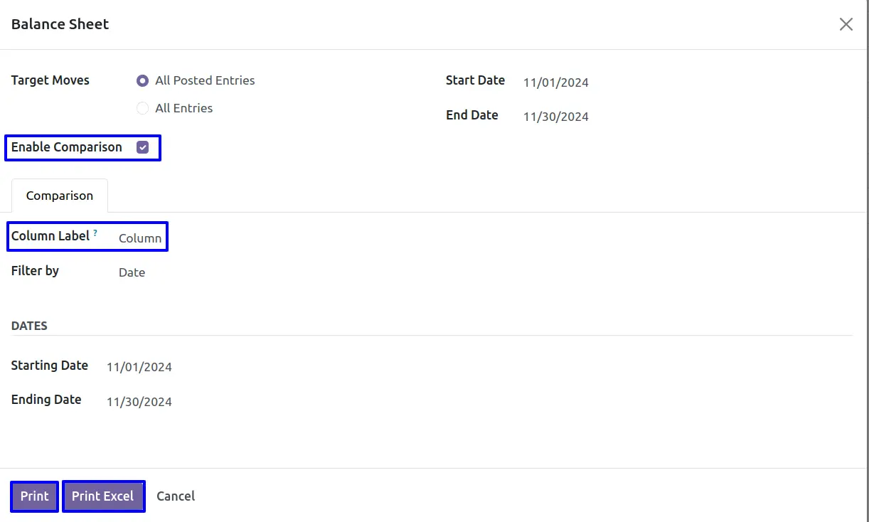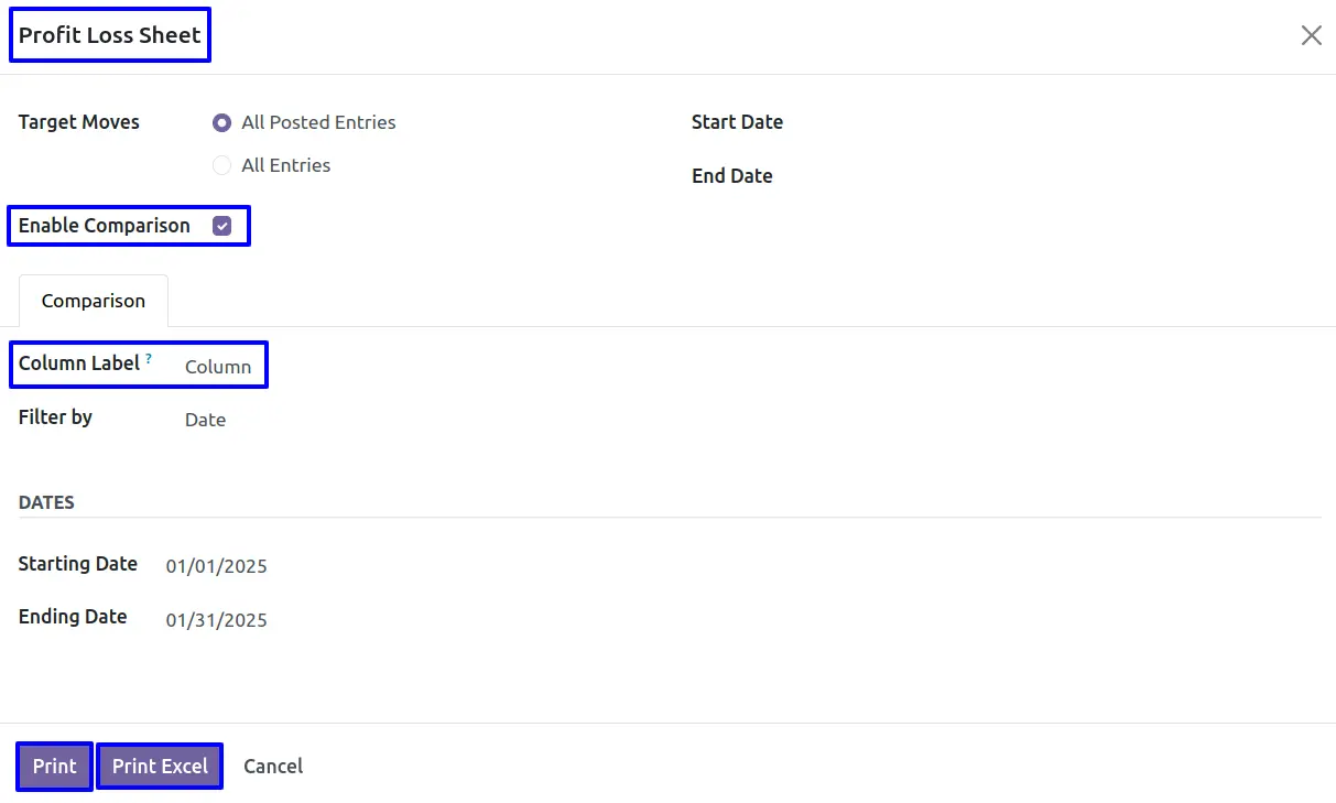 Provide other options on wizard as a Enable Comparison, Column Label, Print, Display Debit/Credit column, Display Accounts etc.