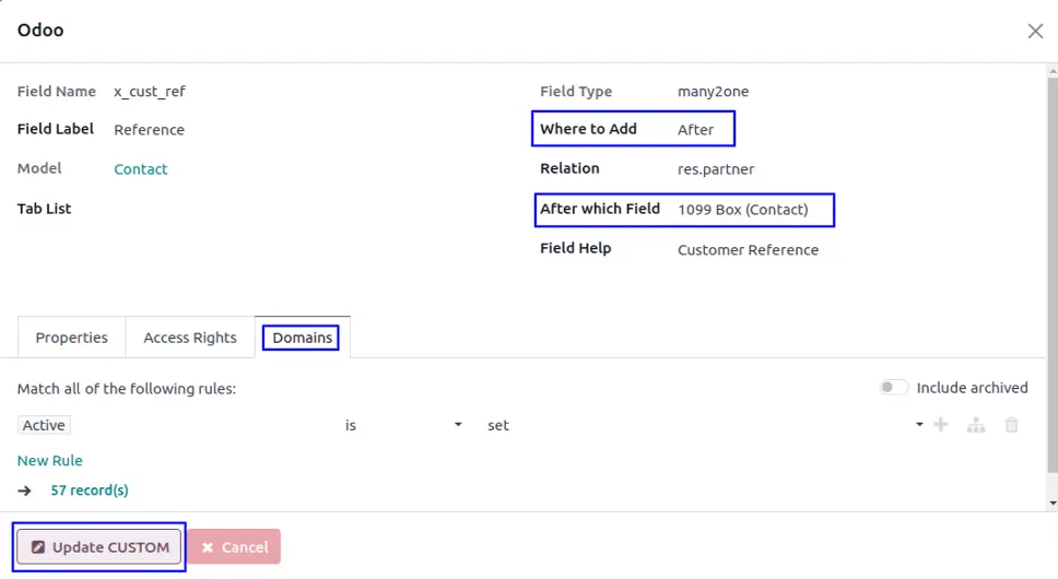 All in one add custom fields odoo app helps user to add global custom fields and tabs to any object, User can add all types of fields like binary, boolean, char, date, datetime, float, html, integer, many2one, many2many, one2many, monetory, selection with fields properties, User can also add bats to any object and also can update fields and tabs, add access rights and add domain for record filter from global fields and tabs view. This Odoo apps is useful for those who need to add custom fields from GUI will find it extremely easy to add custom fields and that too without depending on any technical guys. Practically telling you are just 3 clicks aways from creating and putting a custom field in any form view of Odoo.This Odoo apps user to easily customize any view of Odoo and add custom/user defined fields as much as required. Also it has feature to place field whatever place you want using the option provided on this module wizard.Don't worrry about the security, Only specific user with access of "Custom Field" group can able to do this.