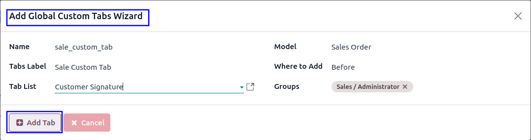 On wizard user have to enter tab name, tabs label model for which tabs will added, User can also choose fields position as "After" or "Before" selected tab.
