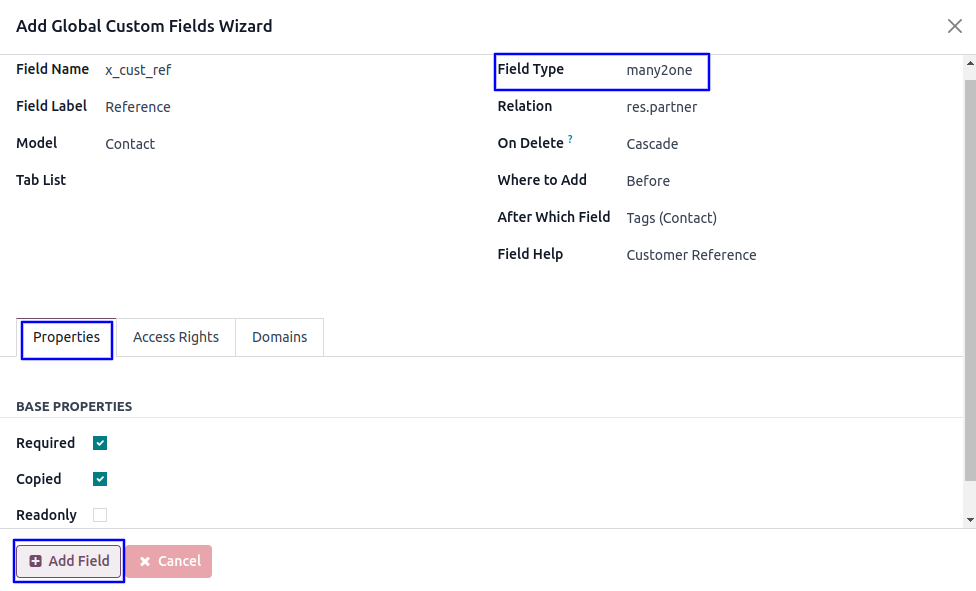 User can also add fields properties like "Required, Copied, and Readonly", also can apply access rights by selection specific groups.