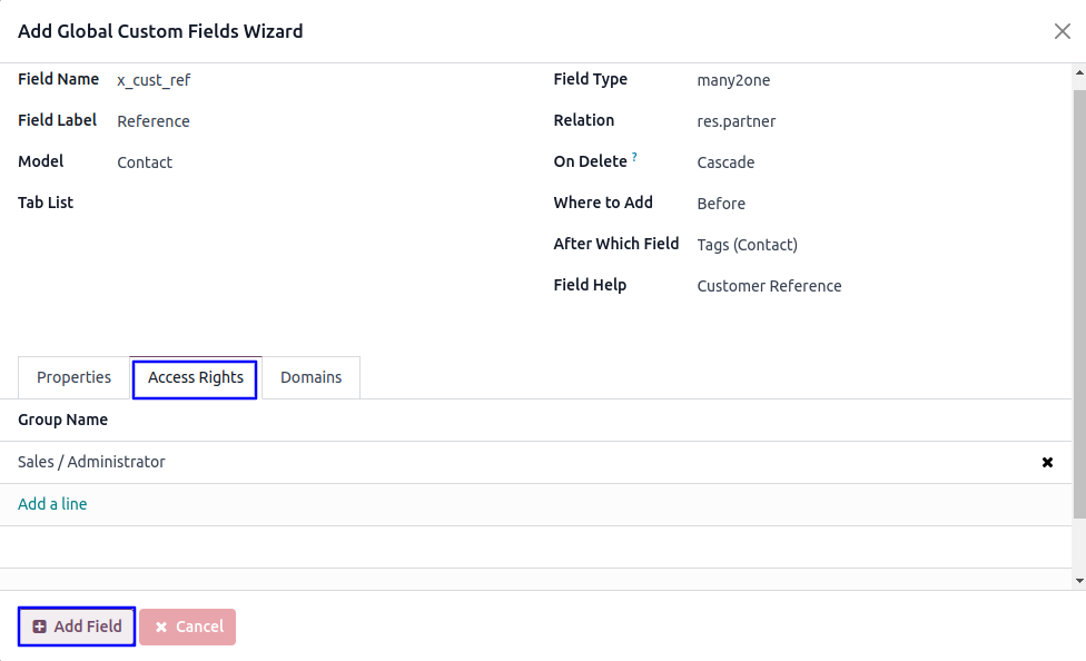 User can update custom global fields and apply access rights and domain, also change position.