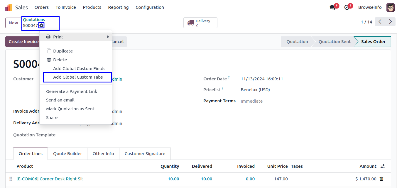 User can find menu to add custom global tabs under action menu as shown bellow image.