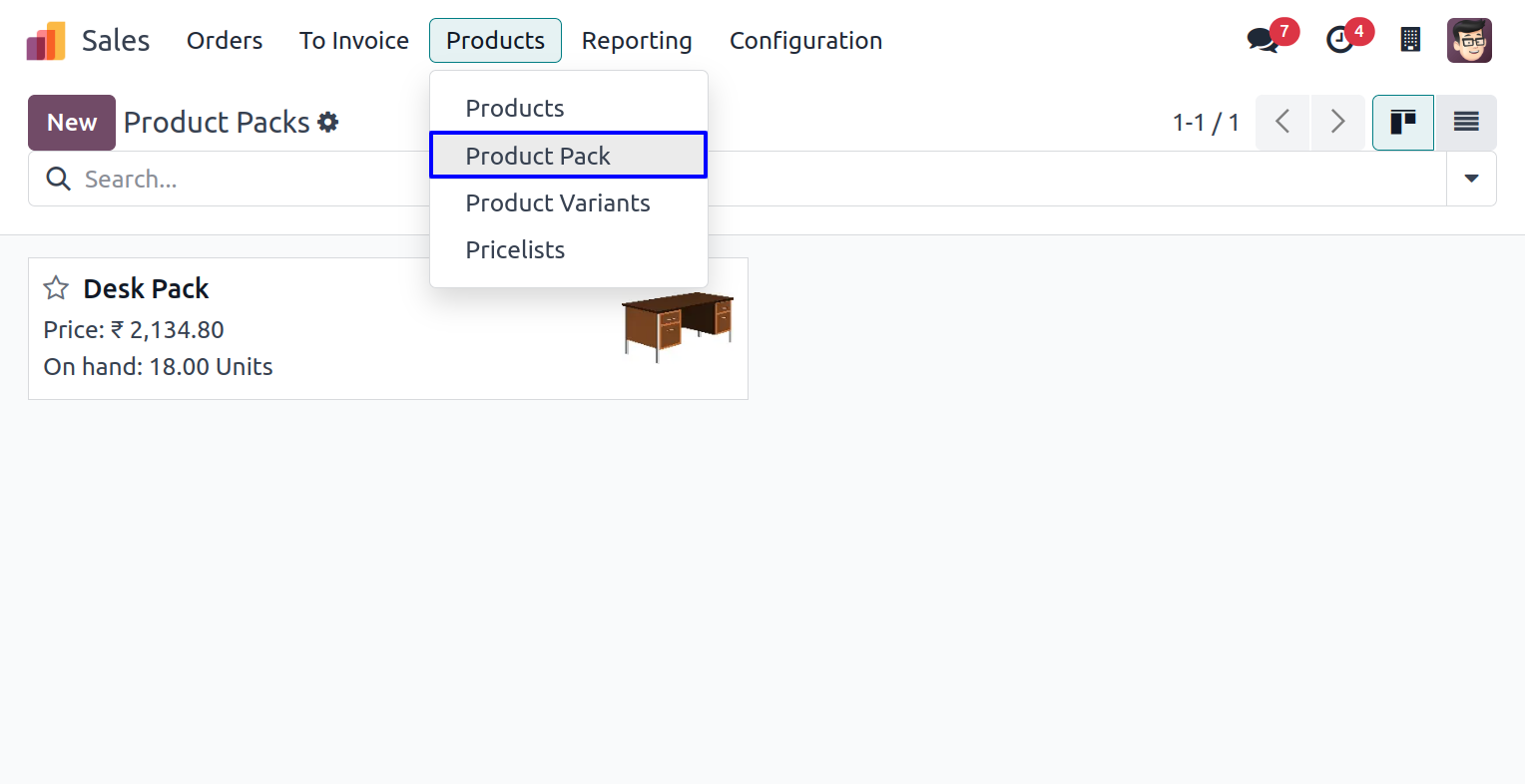 User can create and view product bundle pack from Sales > Products > Product Pack menu.