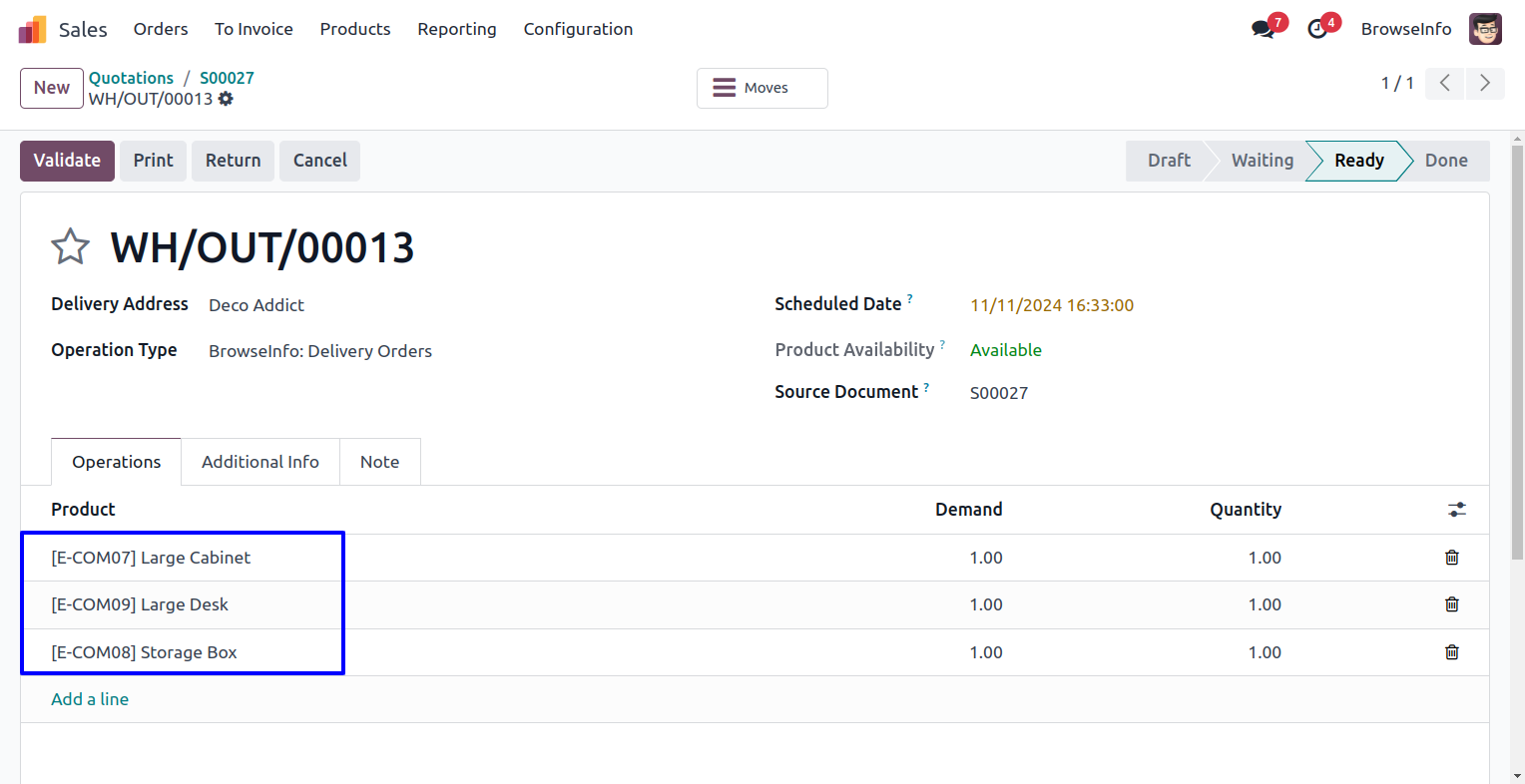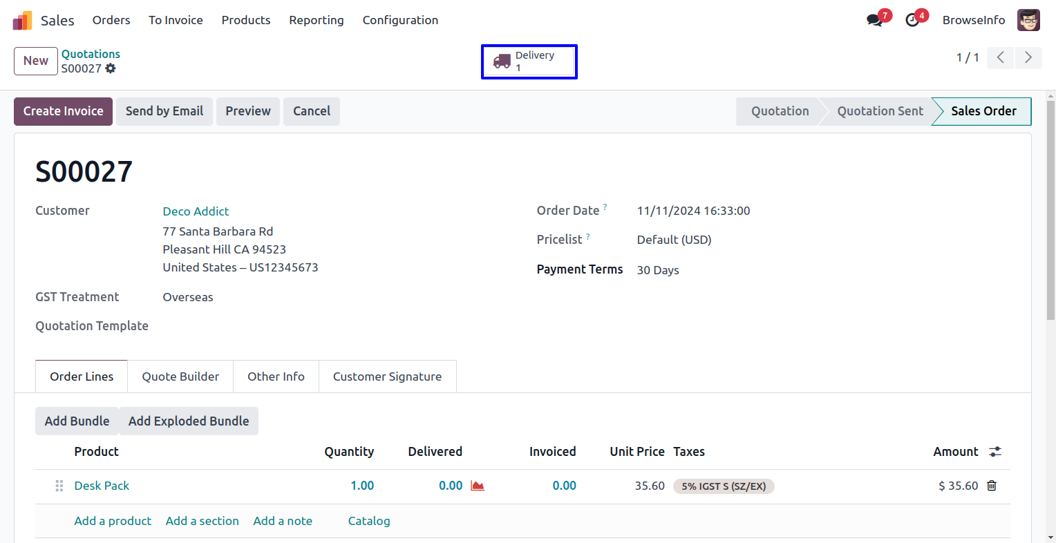 User can see created sales order with selected options.