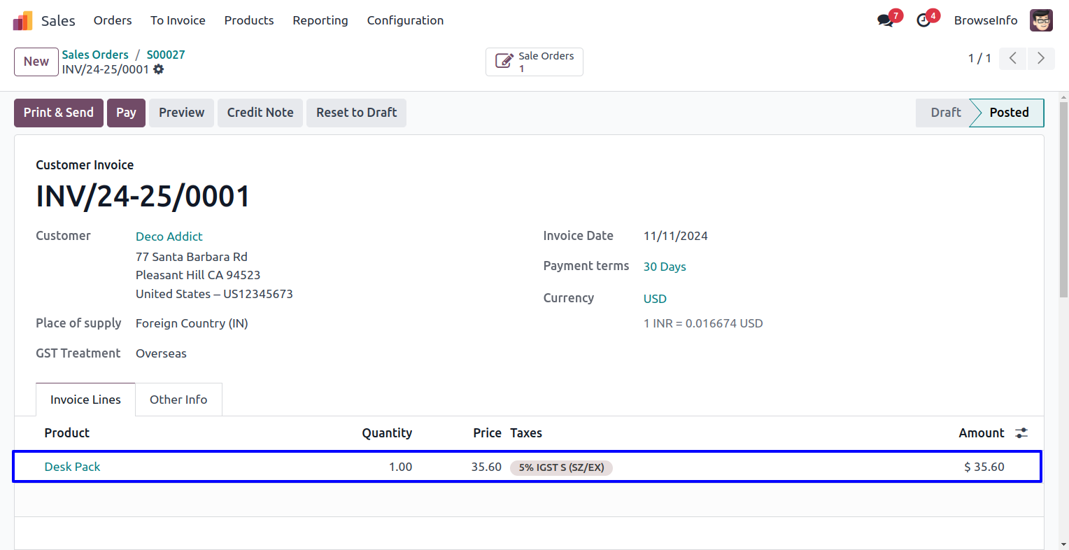 User can see created invoice with selected options.