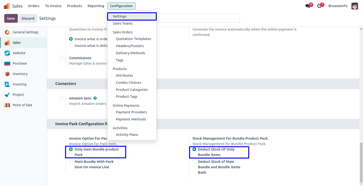 Under Sales > Configuration > Settings menu user have to select invoice and stock management options for pack items. If user selects "Only main Bundle product Pack" as invoice option then only product bundle pack will available on invoice lines, and user selects "Deduct Stock Of Only Bundle Items" option as stock management then only product pack items quantity will deducted from stock.