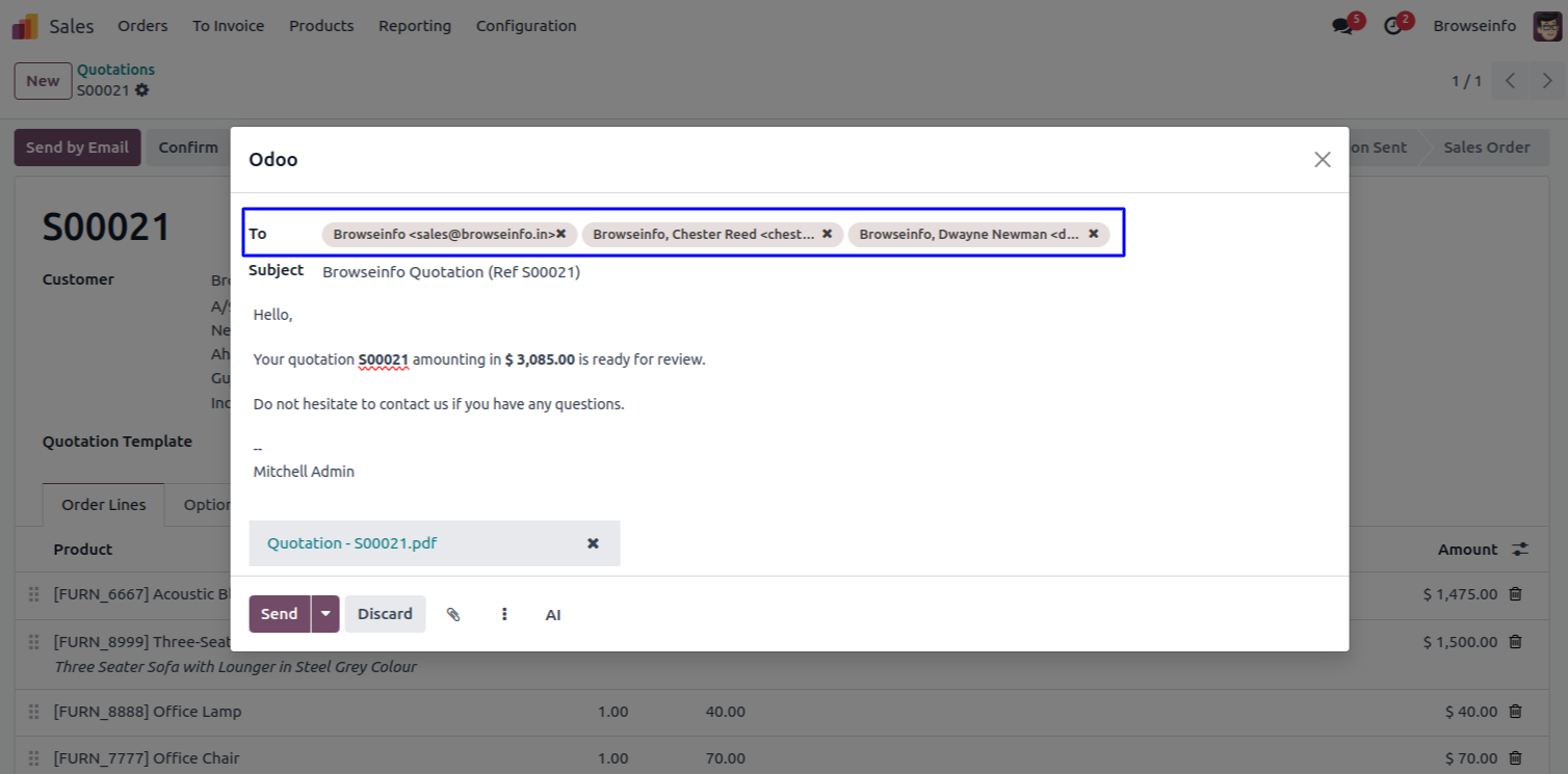 Send Sale Order by Email to Customer's All Contacts Odoo App helps users send a sales order by email to all contacts of the company. This app helps to load all contacts as default recipients on sales orders "send by email" wizard. Sometimes when a sales order is sent to the company it is sent to the company's official email instead of the accounting department.Using this app you can send a sales order by email to all the contacts of the company. After installing this app when you click on send by email wizard on sales order, all contacts of customers automatically set as default on recipients on sales order "send by email" Wizard.