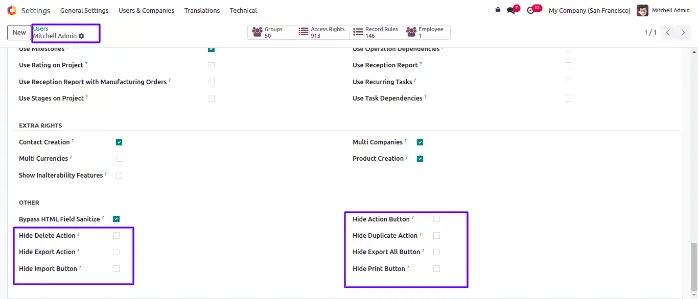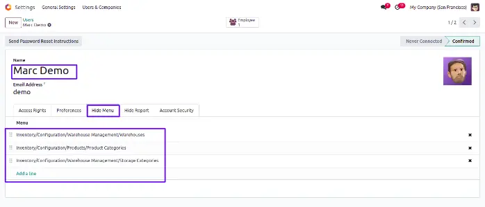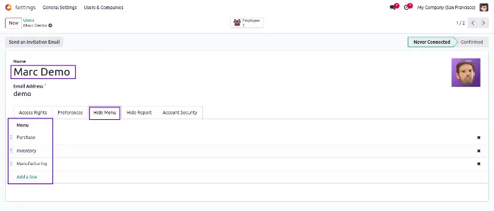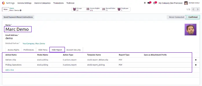 All in one Hide Menu, Buttons, Actions, Fields, Reports Odoo App helps users to hide any menu, sub menu and report from any user from both user configurations and group configurations. Users also can change fields attributes like make fields invisible or read only. Users can hide/show buttons from the user configuration. Users can hide/show import button, export action button, export all button, delete action button, duplicate action button, print button and action button using extra user group access rights. You can just activate those hide access for a specific user and that selected button/action option will be hidden for that specific user.