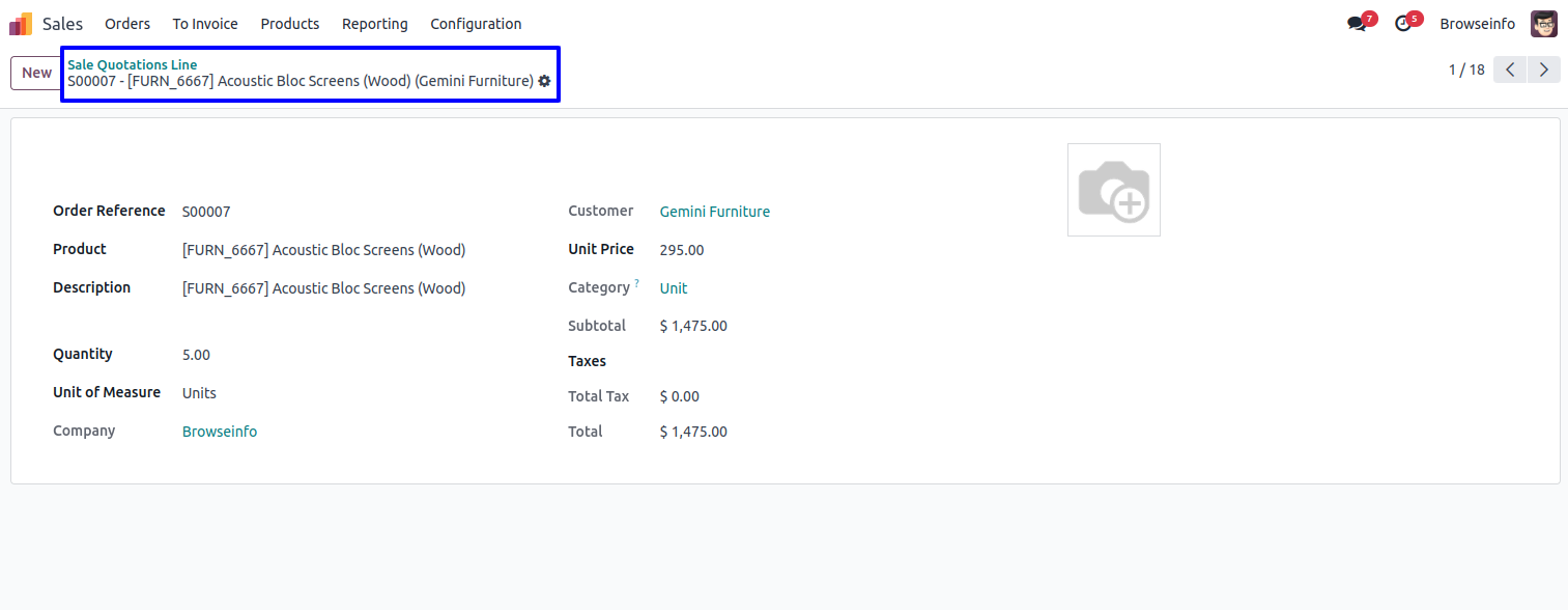 Form View of Sale Quotations Line