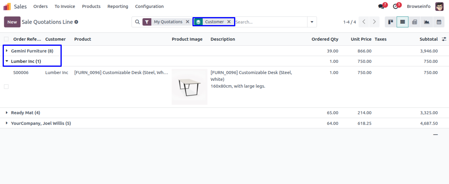 Sale Quotations Line Group By 'Customer'