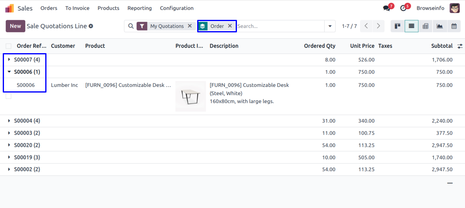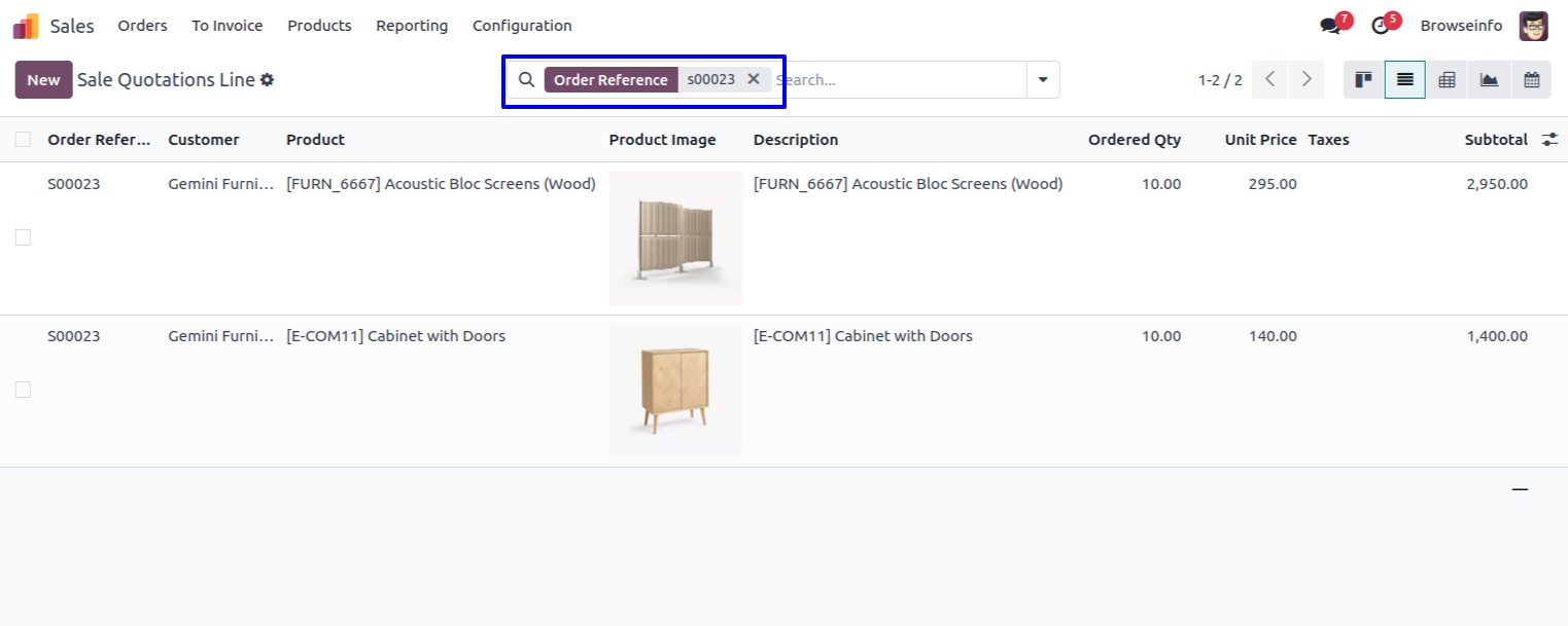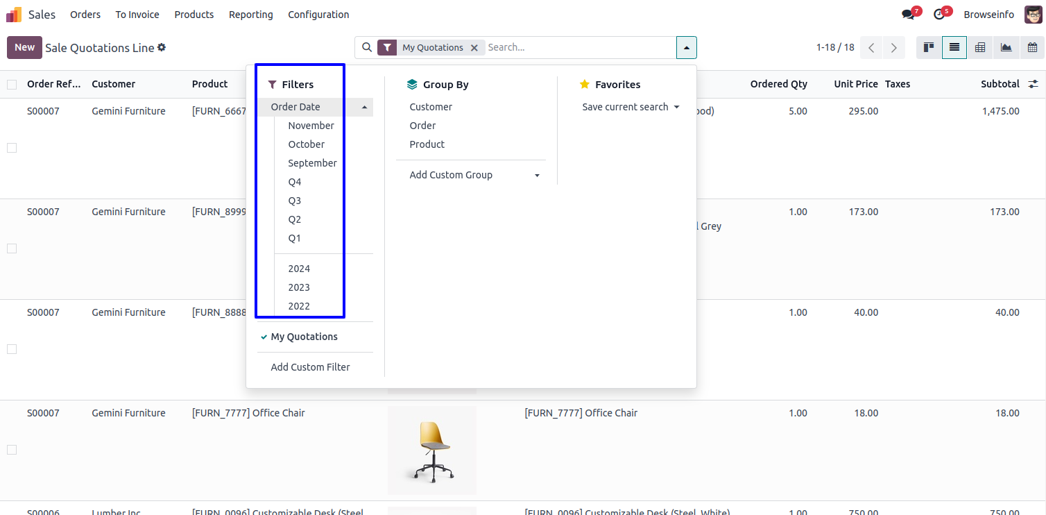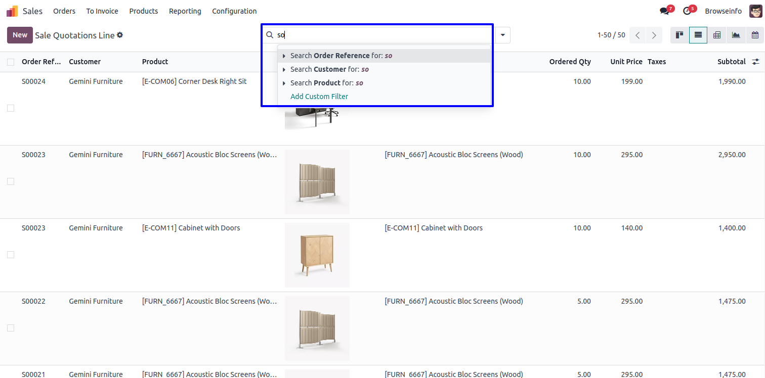 Sale Quotations Line Filters by Any of the Custom Filter