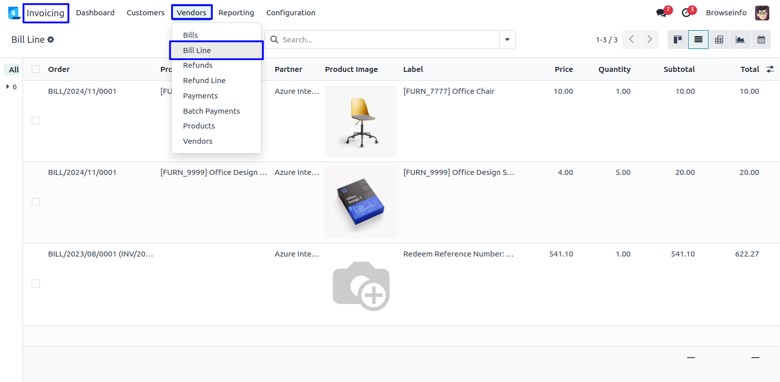 Goto Invoicing -> Vendors -> Bill Line menu in that you can see bill line in list view.