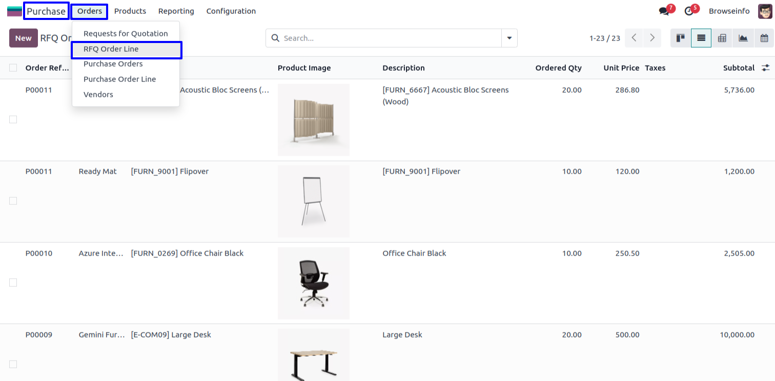 List View of RFQ Order Line