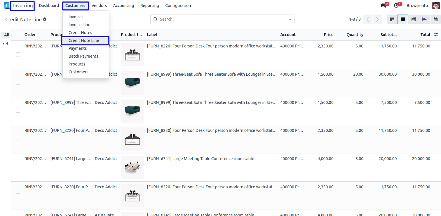 List View of Credit Note Line
