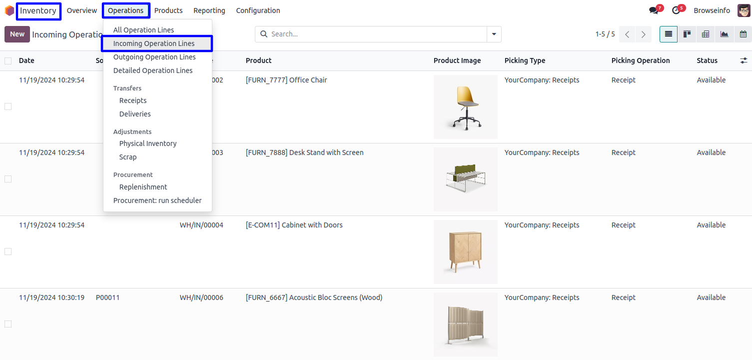 Goto Inventory -> Operations -> Incoming Operation Lines menu in that you can see incoming operation lines in list view.