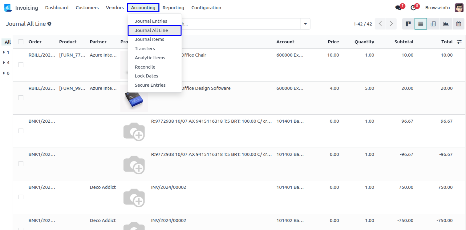 Goto Invoicing -> Accounting -> Journal All Line menu in that you can see journal all line in list view.