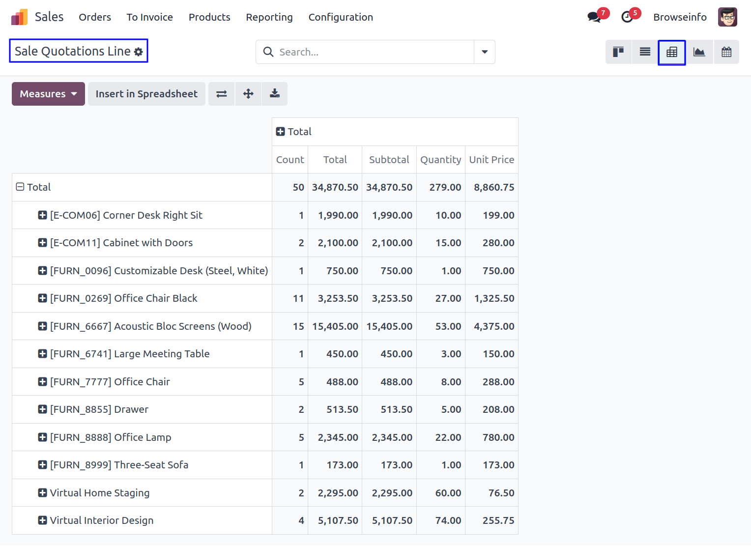 Pivot View of Sale Quotations Line