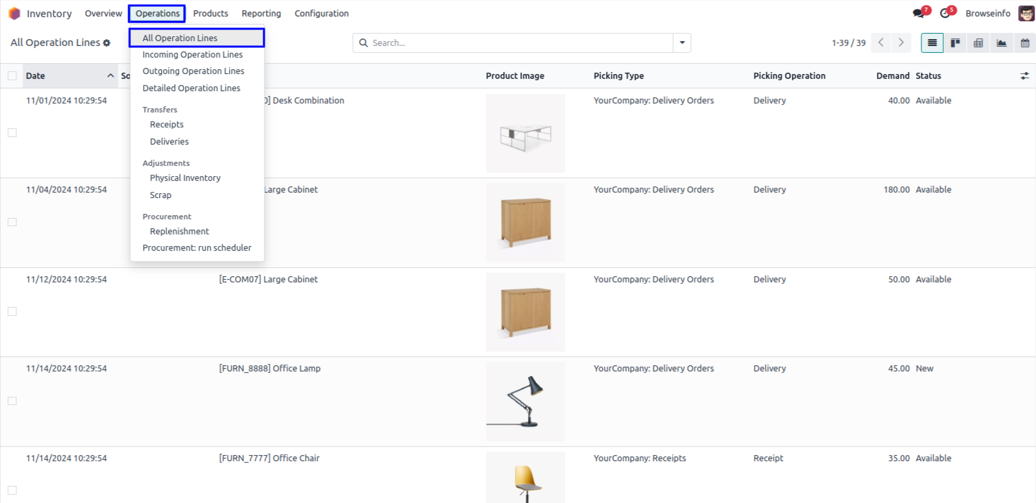 Goto Inventory -> Operations -> All Operation Lines menu in that you can see all operation lines in list view.