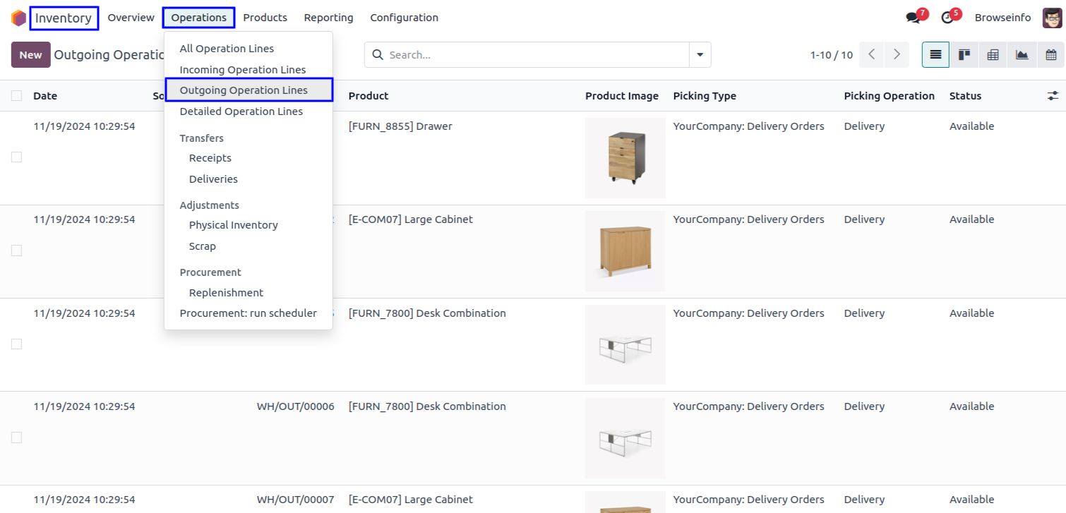 Goto Inventory -> Operations -> Outgoing Operation Lines menu in that you can see outgoing operation lines in list view.