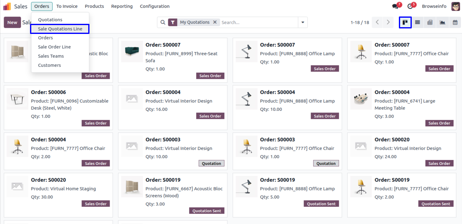 Kanban View of Sale Quotations Line