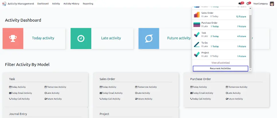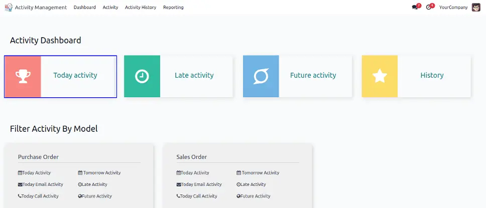 While using activity dashboard user can check today activity, late activity, future activity and activity history with using filter activity by model.