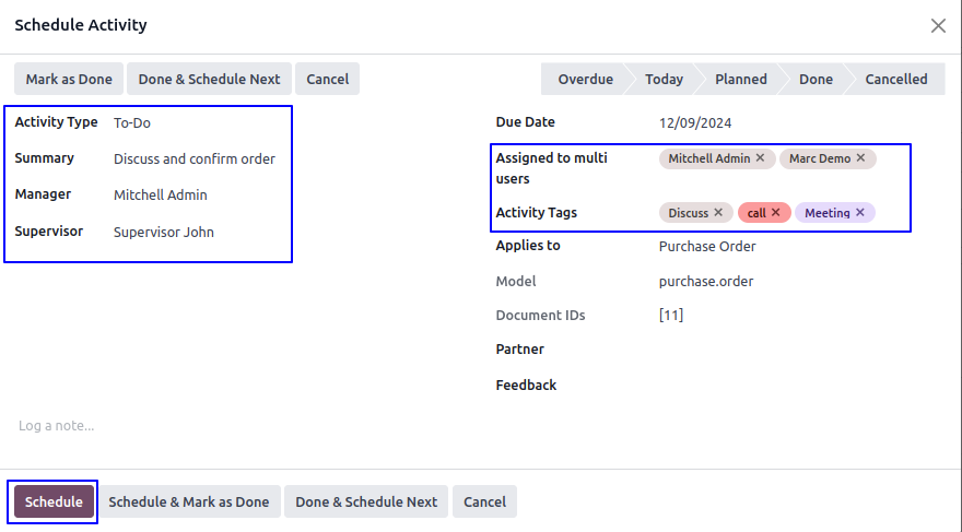 User can select manager and supervisor for activity, user also can assign activity to multiple user, add activity tags, and add description for activity and click "SCHEDULE" button.