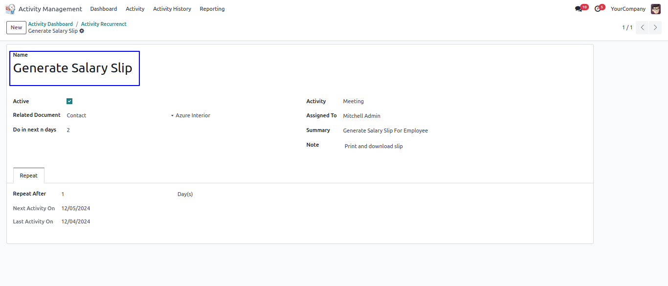 User can create recurrent activity, In the form enter activity name, select related document with that value, select an activity, assigned to person, summary of activity and note.
