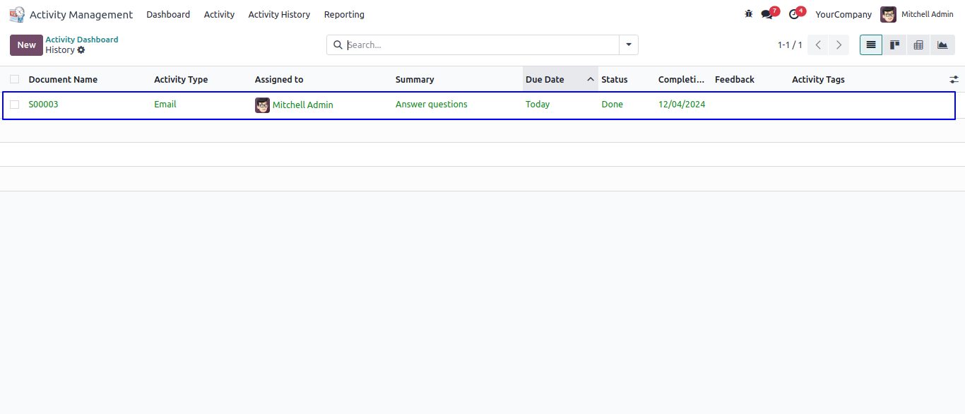 Under Activity Management > Activity history menu user can see all activity history.
