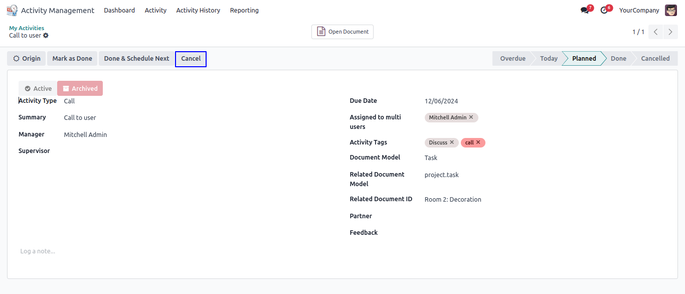 User can cancel activity by clicking "CANCEL" button on activity form view.