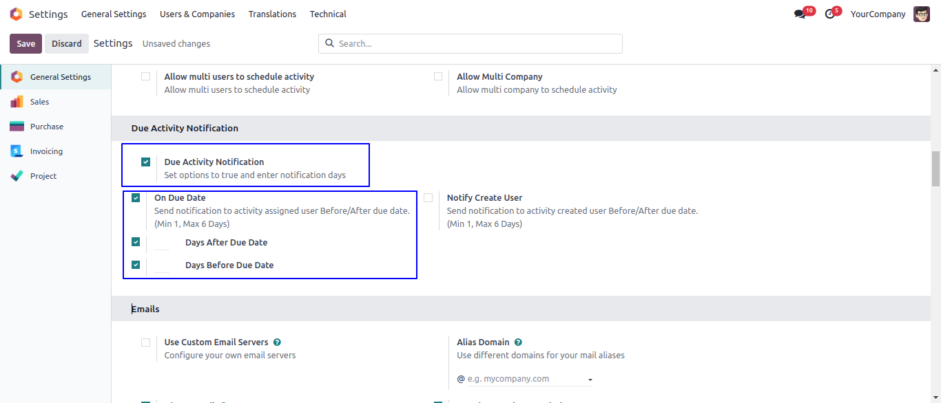 User can enable "On Due Date" option to get email notification for due activity, User need to enter number of days for "Days After Due Date" and "Days Before Due Date" to get email notification.
