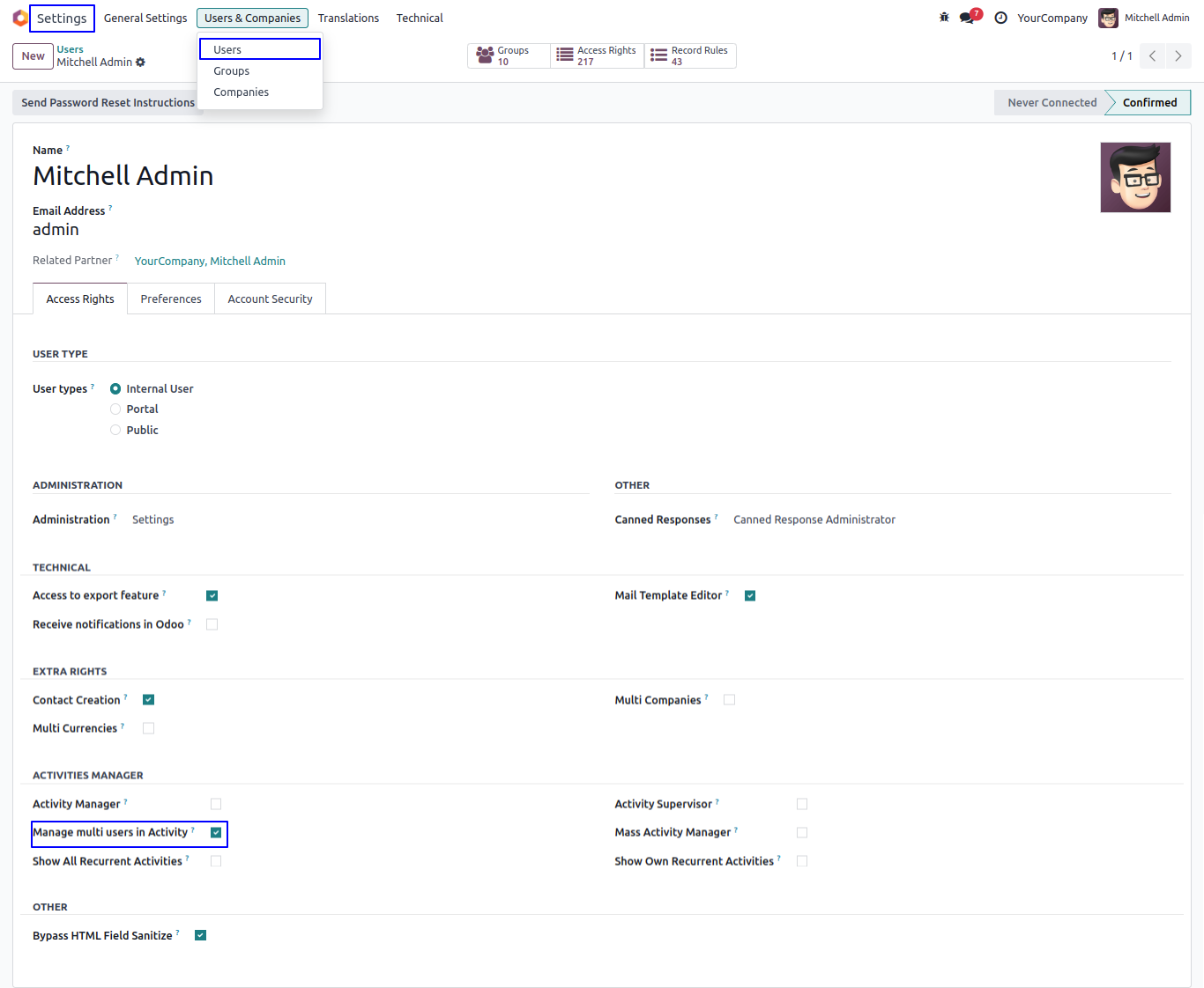 Users with "Manage multi users in Activity" only can create and schedule activity for multiple users at a time.