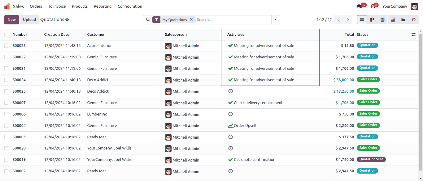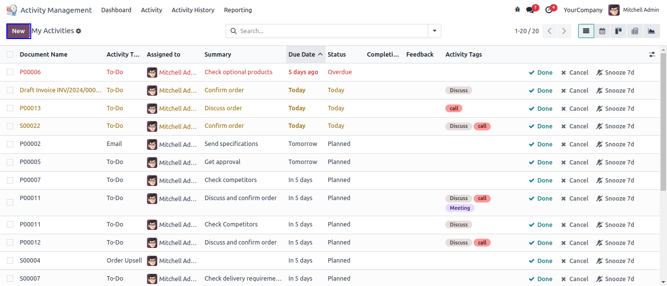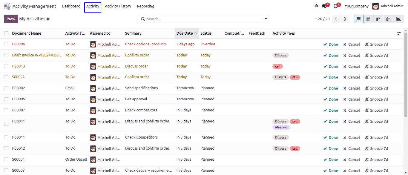 User can use different activity views like a list view, kanban view, calendar view etc.