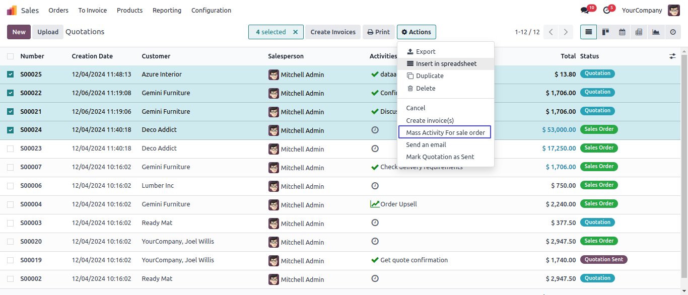User can select multiple record and in Action click on 'Mass Activity for Sale Order' configured action.
