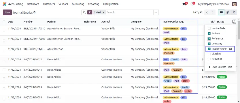 User can easily enable/disable invoice order tags field in tree view of journal entries.