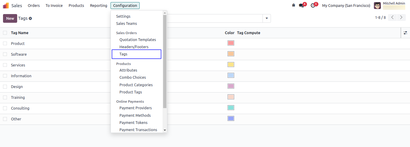 Goto Sales -> Configuration -> Sale Tags menu in that user can create custom tags with selection of color index.