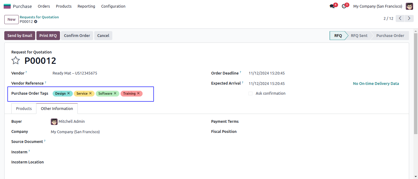User can select or create purchase order tags in form view of purchase order/RFQ.