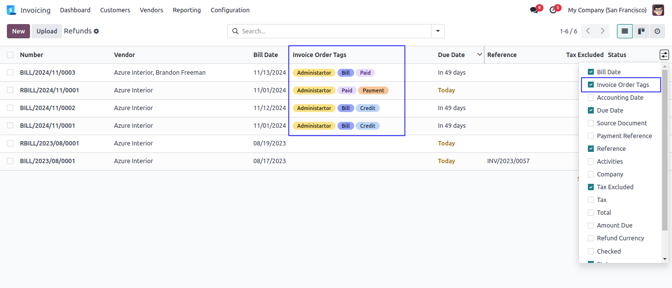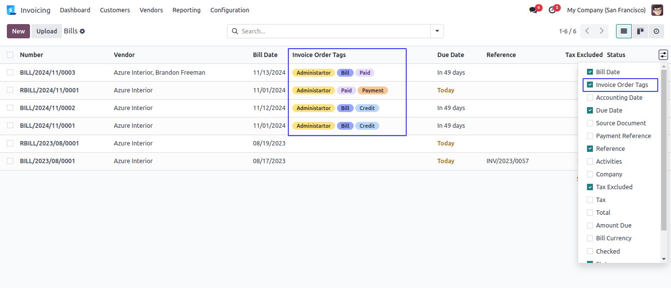 Enable/Disable Invoice Order Tags in Vendor Bills