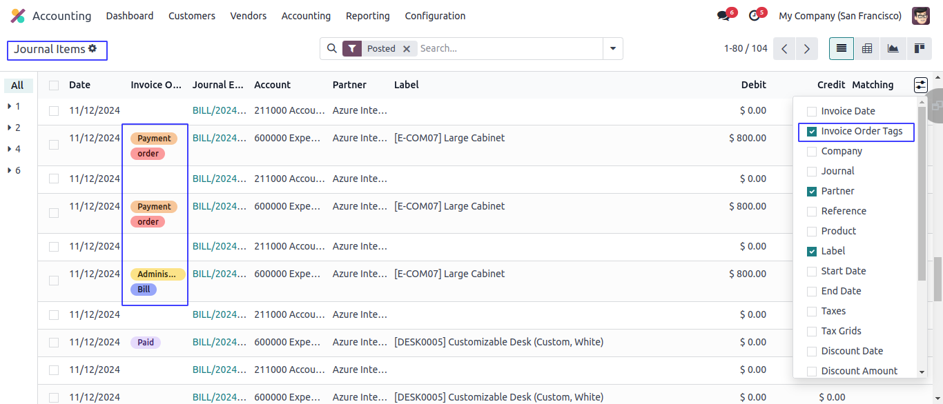 User can easily enable/disable invoice order tags field in tree view of journal items.