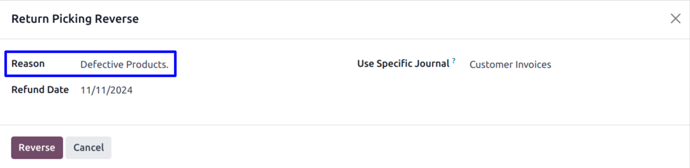 On wizard user can enter return reason, refund date, and specific journal to create credit note either it will be created with journal of invoice and click "REVERSE" button.