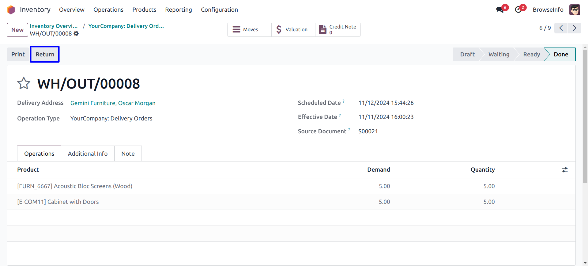 Return delivery order with invoice for product.