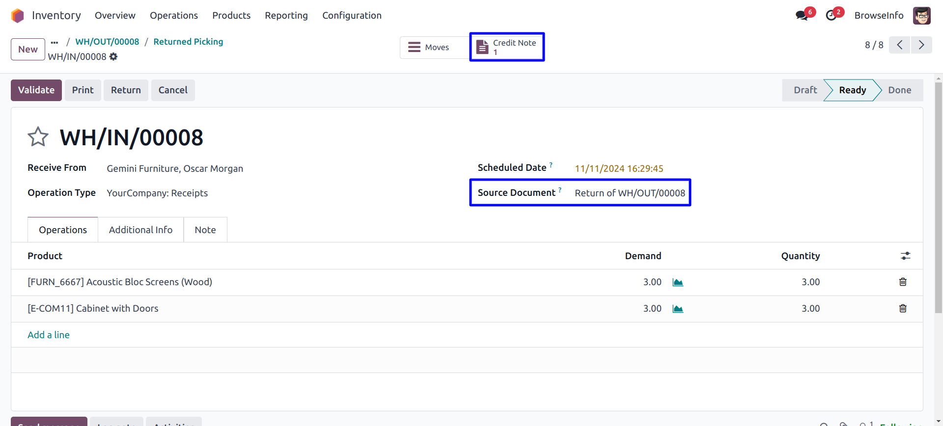 User can see created return transfer and linked customer credit note for delivery order.
